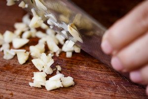 蒜头去皮后用刀背拍扁,然后切成碎末。小葱也切成葱末。待用。