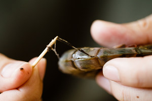 大虾用清水冲洗后,用厨房剪刀剪去头部长须。并用剪刀剪开背部的壳。然后如图,用牙签从背部剪开处挑去虾线。 做这道菜,单重在30-40g之间的虾是不错的选择。太小没有口感,太大的虾对家里的灶头火力要求太高,一不小心就烧得柴。泰国或者越南的大只黑虎虾、厄瓜多尔白虾都是不错的选择。这次用的是山姆会员店的泰国产黑虎虾。