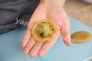 取20g豆沙馅/莲蓉馅压扁包入冷冻好的奶酪蔓越莓馅/抹茶蜜豆馅(古方黑糖椰丝馅可直接使用)。(四)