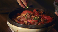预热砂锅,牛肉牛筋倒入炒香的番茄中,加一点料酒