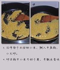 洗净沥干水分的小米,放入平底锅,用小火炒