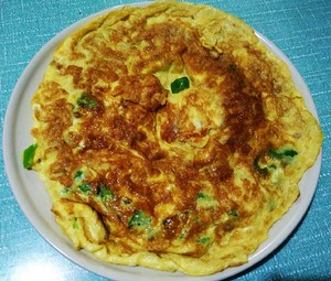 画圈晃动锅子让蛋液受热凝固,形成饼状,火不要太大避免煎糊。所有蛋液七八成凝固时,就可以颠勺翻个了。未熟的部分包括青椒粒会被翻到朝下,继续煎熟即可出锅。