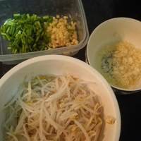 大约一个小时后可以取出冷藏好的面接下来,豆芽洗净后放入沸水中焯烫后捞出。沥干水分,葱切葱花,姜切末,蒜做成蒜泥,加一点点的水。