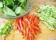 红椒和黄瓜切丝,荆芥切成断备用