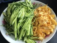 鸡蛋加一点盐打散,摊成鸡蛋饼,切丝;黄瓜切丝备用