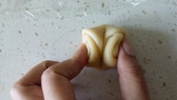 取一个面团卷,收口向上,用手指摁在中间略用力按压一下,使两端向中间捏合。