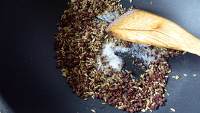 自制椒盐,就是等量的椒盐加小茴香,用炒锅小火慢炒,炒香后加入等量的盐继续翻炒到微黄,香味更浓时取出。不要炒糊。倒入料理机中打成粉状。一次性可以多做一些,用不完的可以炒菜做椒盐花卷之类的。但也不要做的过多,自制椒盐没有其他添加所以粉容易变潮结块。